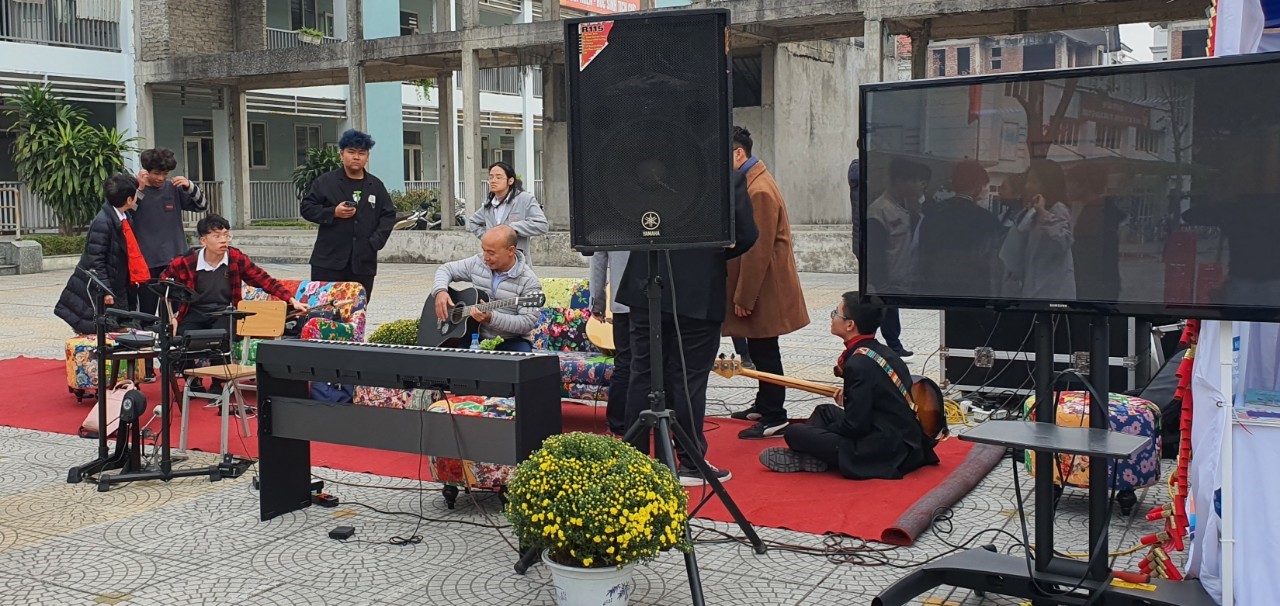 Sau phần lễ trang nghiêm, phần hội đã diễn ra tưng bừng trong thời tiết se lạnh. Những cành đào hồng rực, cành quất, chậu cúc vàng cùng tiếng trống hội múa rối nước làm không khí chào xuân thêm rộn ràng. Các con học sinh đã được học tập, trải nghiệm nhiều hoạt động thú vị, bổ ích như xem, tìm hiểu phần múa rối nước truyền thống, hội chợ ẩm thực xuân truyền thống. Bên cạnh đó, các con còn được trải nghiệm, giao lưu âm nhạc tại khu trưng bày nhạc cụ trong gian hàng của trường THCS Well spring. Trong không gian rộng rãi được bày một bộ trống, một cây đàn piano điện, một số cây guitar Aucostic và một vài cây guitar điện cùng những bộ bàn ghế có màu sắc và họa tiết ấn tượng đã khiến gian hàng thực sự tràn ngập vẻ hiện đại, hấp dẫn các em học sinh tới giao lưu trải nghiệm.