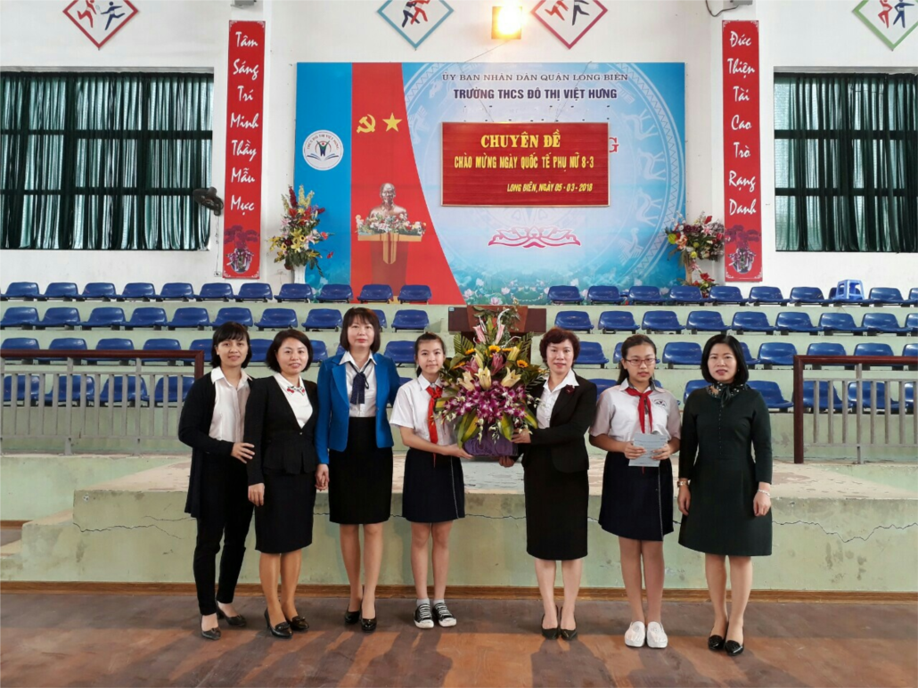 Mở đầu buổi lễ, cô giáo Trần Thị Huyền- Chủ tịch công đoàn- đã ôn lại truyền thống ngày Quốc tế Phụ nữ 8/3 và lịch sử vẻ vang của cuộc khởi nghĩa Hai Bà Trưng. Kế thừa và phát huy truyền thống tốt đẹp của phụ nữ Việt Nam, các nữ cán bộ giáo viên nhân viên trường THCS Đô Thị Việt Hưng đã không ngừng phấn đấu rèn luyện, cống hiến tài năng, trí tuệ, đóng góp quan trọng cho sự nghiệp phát triển của nhà trường. Tiêu biểu là các cô giáo trong Ban giám hiệu đã tích cực học tập, nâng cao nhận thức về chính trị, trình độ học vấn để đáp ứng yêu cầu của sự nghiệp trồng người trong thời kỳ đổi mới. Nhiều cô giáo được tuyên dương vì có thành tích trong trong phong trào “giỏi việc trường, đảm việc nhà”trong năm học 2017- 2018. Tiêu biểu là các cô giáo Nguyễn Thị Thương – Giải Nhì Hội thi GVG cấp Quận, giải Ba thi kĩ năng CNTT cấp Quận, danh hiệu “Giỏi việc trường- đảm việc nhà” cấp Quận; cô giáo Đinh Thị Kim Yến- danh hiệu GVG cấp Quận; cô giáo Lê Hồng Hạnh- giải Nhì thiết kế bài giảng Elearning cấp Quận; cô Nguyễn Ngọc Trâm – giải Nhì thi kĩ năng CNTT cấp Quận; cô Lê Thị Lan- danh hiệu Tổng phụ trách giỏi cấp Quận; cô giáo Vũ Thị Thanh Thảo giảng dạy thành công chuyên đề cấp Quận mô hình Trường học mới. Đây là những thành tích đáng tự hào của các nữ cán bộ giáo viên nhân viên nhà trường.