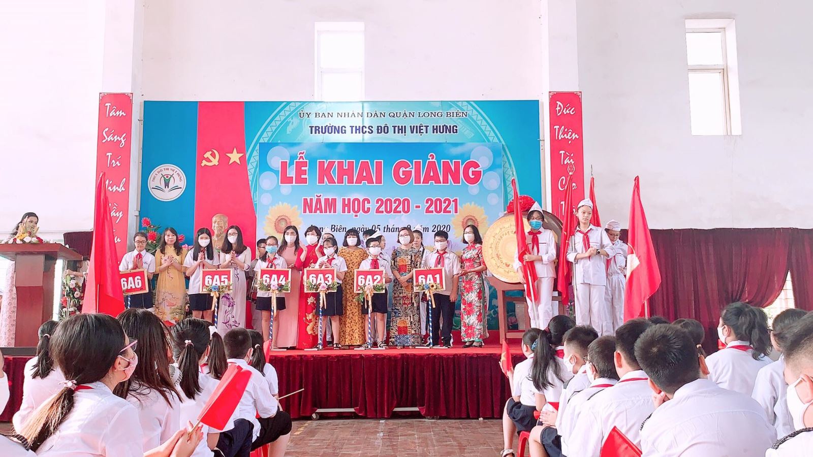 Nhằm đảm bảo cô !important;ng tác phòng chống dịch bệnh Covid-19, trường THCS Đô Thị Việt Hưng đã tổ chức lễ khai giảng ngắn gọn nhưng vẫn trang trọng, ấn tượng. Khác với mọi năm, lễ khai giảng của trường THCS Đô Thị Việt Hưng chỉ có học sinh khối 6 tập trung dự lễ khai giảng để đảm bảo giãn cách, còn các khối 7, 8, 9 tổ chức khai giảng tại lớp học của mình. Buổi lễ gồm những nghi thức sau: Đón học sinh lớp 6, chào cờ, hát Quốc ca, đọc thư của Chủ tịch nước, đánh trống khai trường, cảm nghĩ của học sinh, …
