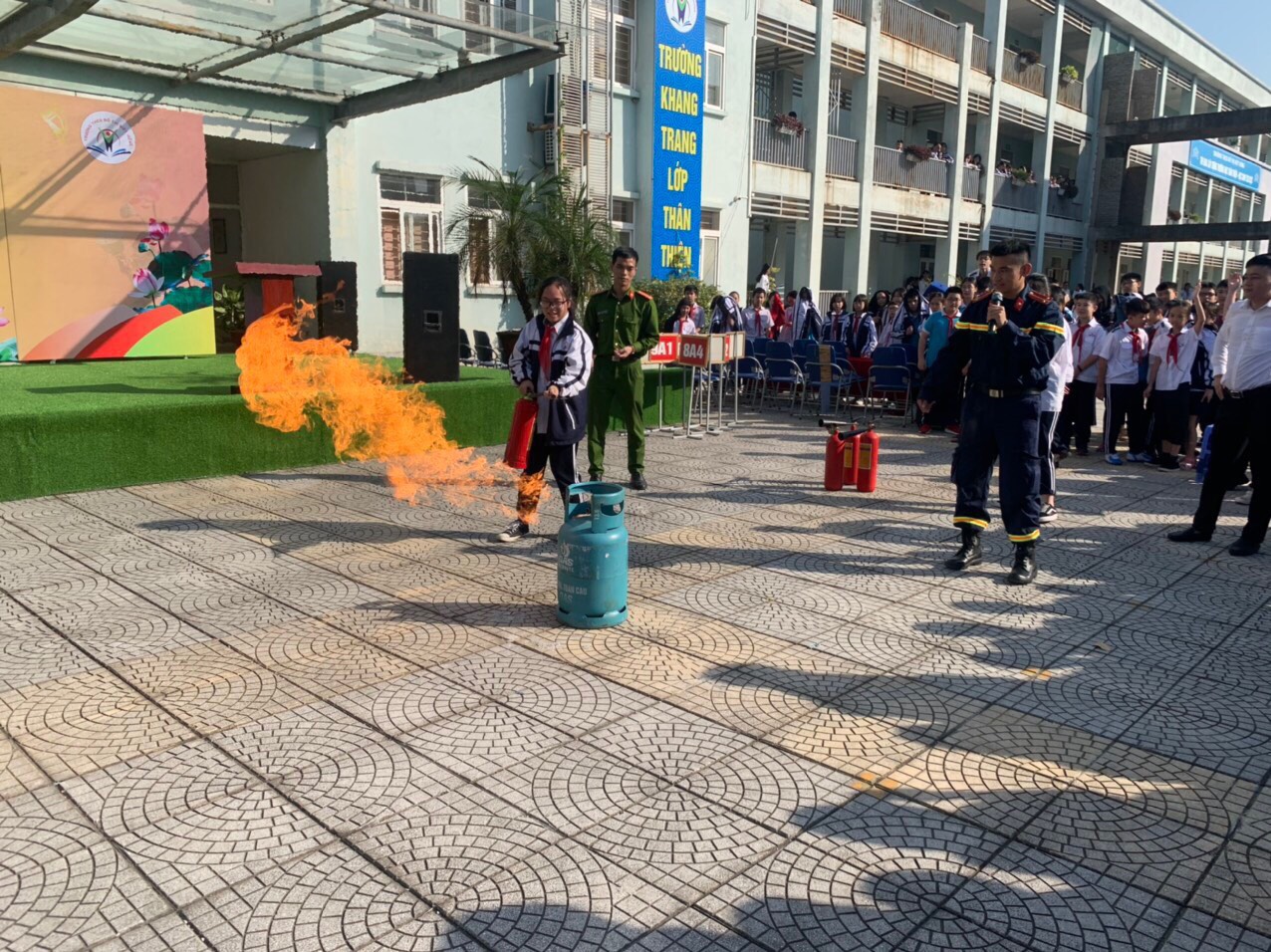 Sau phần hướng dẫn lý thuyết, dưới sự giúp đỡ của Cảnh sát Phòng cháy chữa cháy (PCCC), đã hướng dẫn cách sử dụng các phương tiện bình bột, bình CO2 để dập tắt đám cháy và cách thức xử lý nhanh các tình huống có thể xảy ra.