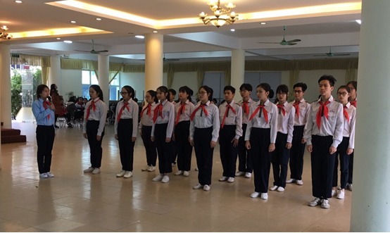Cô giáo Lê Thị Lan cùng học sinh lớp 8A4 tham gia phần thi thực hành kỹ năng, nghiệp vụ làm công tác Đội
