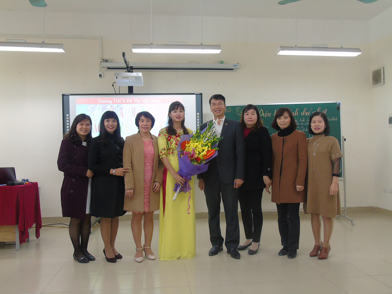 Các đồng chí trong BGK và BGH tặng hoa chúc mừng cô giáo Hoàng Thu Trang đã hoàn thành tốt tiết dạy