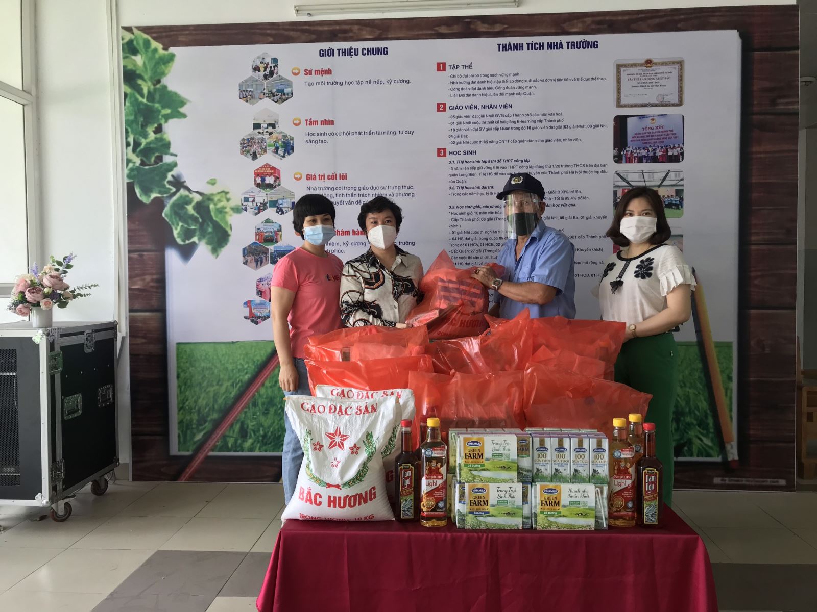 Trong tình hình dịch bệnh covid 19 liên tục có những biến chủng lây lan khôn lường, thành phố đã có 2 đợt thực hiện chỉ thị 16 về việc giãn cách xã hội trong công tác PCDB, nhiều gia đình GV, NV và học sinh gặp không ít những khó khăn như: Ở trong vùng phong tỏa, cách ly, công việc lao động, kinh doanh tạm ngừng, nguồn thu nhập bị hạn chế nên cuộc sống gặp nhiều những trở ngại. Để động viên kịp thời các gia đình, nhà trường đã huy động các nguồn lực và BCH Công đoàn nhà trường đã tổ chức trao hơn 20 suất quà là những nhu yếu phẩm thiết yếu như: sữa, gạo, mắm, dầu ăn,... tới từng GV, NV, những hợp đồng lao động và gia đình học sinh.