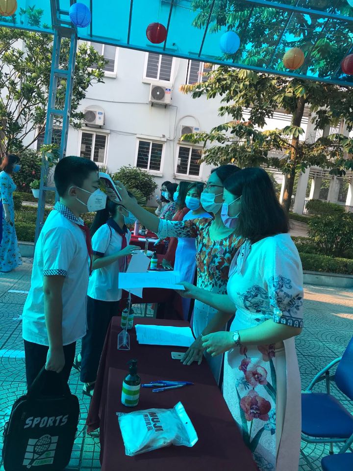 Trong những ngày học sinh mới quay lại trường học, nhà trường tổ chức đo thân nhiệt cho học sinh khi đến trường (2 lần/ngày đầu giờ sang và đầu giờ chiều) thường xuyên hướng dẫn học sinh kỹ năng vệ sinh cá nhân, duy trì môi trường thoáng mát tại các lớp học. Trường thực hiện nghiêm việc đo thân nhiệt, đeo khẩu trang, khai báo y tế đối với 100% GB-GV-NV và học sinh và những người đến làm việc tại nhà trường. Đồng thời, yêu cầu tất cả cán bộ, nhân viên, phụ huynh đeo khẩu trang trong và ngoài khuôn viên trường học. Nhà trường cũng phối hợp với phụ huynh học sinh, giáo viên, theo dõi sức khỏe của học sinh trước, trong và ngoài giờ học, giám sát quá trình di chuyển trong vòng 21 ngày và nghiêm túc thực hiện cách li nếu có yếu tố dịch tễ.